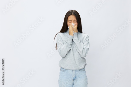 Asian woman holding hand with handkerchief and coughing up flu and cold, stuffy nose viral disease asthma and allergies covid 19 white background