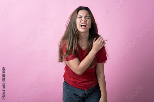 Asian woman in a red shirt with long brown hair grimaces in pain while holding her shoulder, standing against a solid pink background.