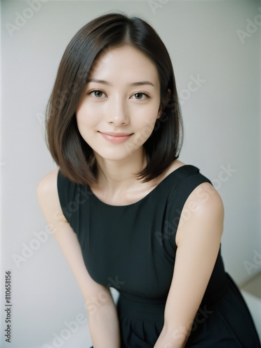 Asian woman in black dress with short hair.