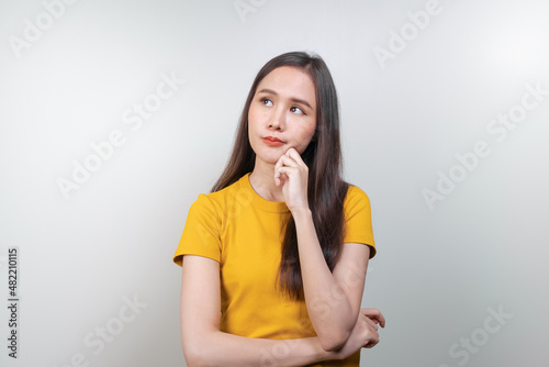 asian woman in color casual dress thinking and imagination isolated on pink background