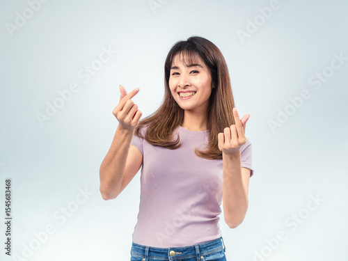 Asian woman in purple shirt making Korean finger heart gesture with both hands while smiling confidently, standing against a clean light studio background