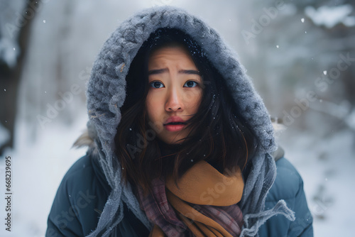 Asian woman lost in snowy winter forest at day. Neural network generated image. Not based on any actual person or scene.
