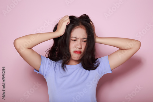 Asian woman making a stressed expression Standing alone on a light pink background. Beautiful young woman is feeling stressed.