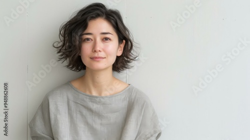 asian woman model wearing a white t-shirt standing in front of a plain white background, fashion and style concept, minimalist design, copy space