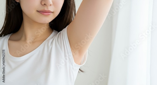 Asian Woman Showing Smooth Armpit With White T-Shirt And Light
