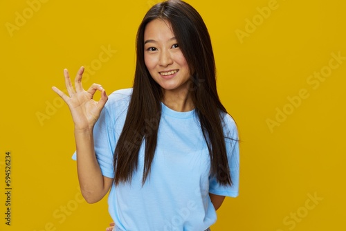 Asian woman smile with teeth hand gestures, signs and symbols on yellow background in blue t-shirt and jeans