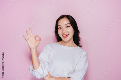Asian Woman Smiling and Making Okay Sign on Pink Background - Positive Emotion Communication Concept for Advertising and Social Media Content