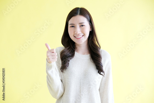 Asian woman thumb up and smile while standing isolated over yellow background, Happy asia girl showing good, great gesture sign, positive expression