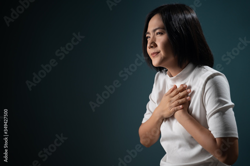 Asian woman was sick with chest pain and standing isolated over blue background. Health care concepts.