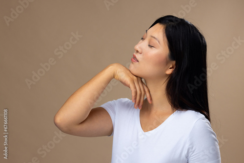 Asian woman wearing natural makeup and white t-shirt on beige background, copy space