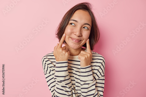 Asian woman with dark hair keeps fingers near corner of lips has satisfied expression looks aside dressed in long sleeved striped jumper and hat has fake smile on face isolated over blue background