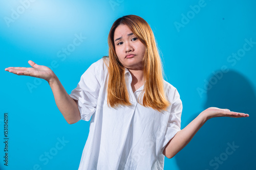 Asian woman with long hair in a white shirt making a confused shrug gesture with both hands raised, expressing uncertainty or doubt against a vibrant blue background in studio light