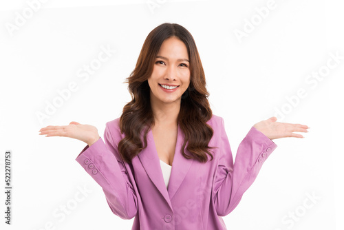 Asian woman with long hair wearing a suit with both hands on a white background.