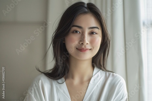 Asian woman with subtle makeup and a perfectly styled hairstyle. on grey background