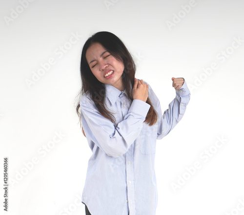 Asian women with light blue shirt and long hair having a shoulder and neck pain. Indonesian girl with hand on shoulder isolated on horizontal white background from front angle view.