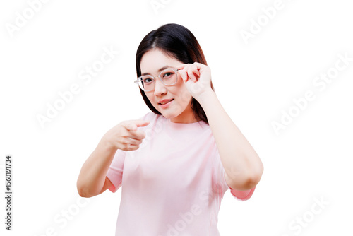 Asian young beautiful woman in a pink shirt adjusts her glasses while pointing forward with a confident expression.