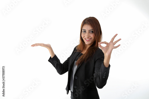 Asian young Indian woman wearing formal business office ware on white background ok hand finger sign show palm of hand