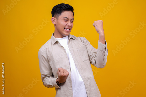 asian young man celebrating while raising hands isolated on yellow background