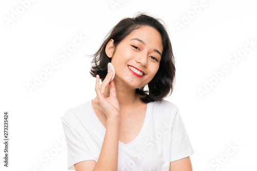 Asian young woman removing makeup from her face with cotton pad