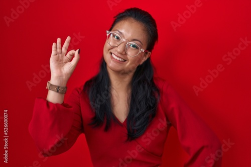 Asian young woman standing over red background smiling positive doing ok sign with hand and fingers. successful expression.