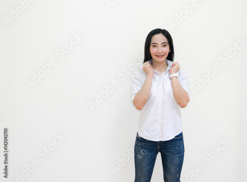 Asian young woman thinking beautiful smile put a white shirt stand of on white background.