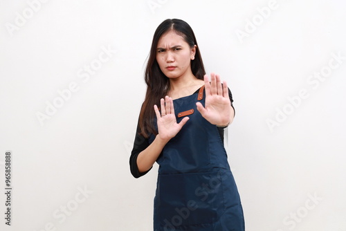 Asian young woman wearing apron over white background disgusted expression, displeased and fearful doing disgust face because aversion reaction.