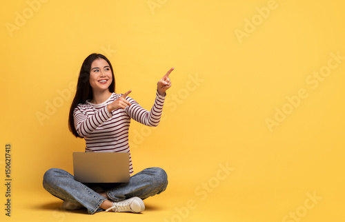 Asian young woman with long hair sits cross-legged on the floor, smiling and pointing at copy space. She has a laptop in front of her on the ground against a cheerful yellow backdrop.
