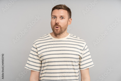 Astonished man looking open mouth in amazement, omg, surprised from ad offer opportunity. Shocked middle aged caucasian male with excited expression round eyes, isolated studio background. Omg, wow
