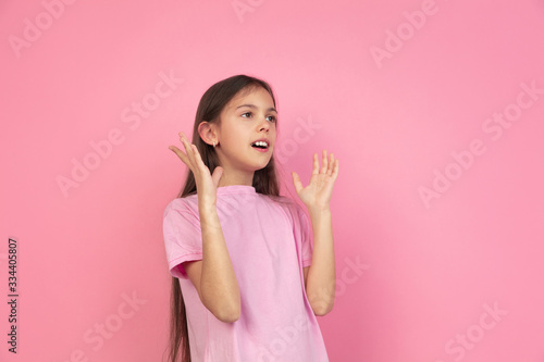 Astonished, shocked. Caucasian little girl portrait isolated on pink studio background. Cute brunette model in shirt. Concept of human emotions, facial expression, sales, ad, childhood. Copyspace.
