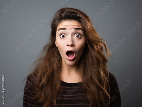 Astonished woman with raised eyebrows and dropped jaw, against a gray background. Expressing surprise, shock, and disbelief