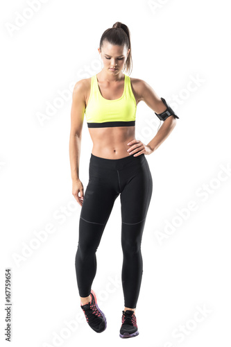 Athletic fit female jogger warming up with foot ankle rotation exercise. Full body length portrait isolated on white studio background