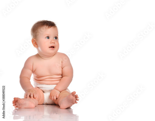 Attentive infant child baby boy in a diaper sitting on a white background.