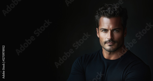 Attractive 40-year-old man portrait on a dark background. Masculine elegance, self-care, fitness, grooming. Confidence, strength, modern masculinity. Luxury men's perfume, personal care, men's beauty