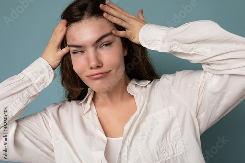Attractive amusing funny joyful positive cute nice adorable tender young curly brunette woman wearing white shirt isolated on blue background