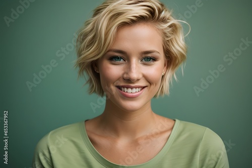 Attractive and Happy young Swedish woman with short blonde hair on a solid light green background. Generative ai.