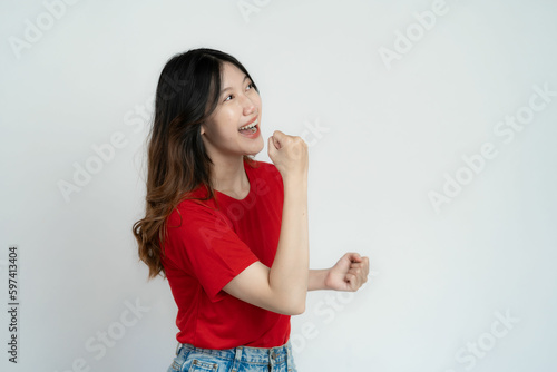 Attractive Asian beautiful woman standing on white background and doing hand gestures.