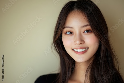 Attractive Asian model with flawless skin and a smile on a beige background Female beauty influencer and makeup artist in a studio setting Focus on skincare co