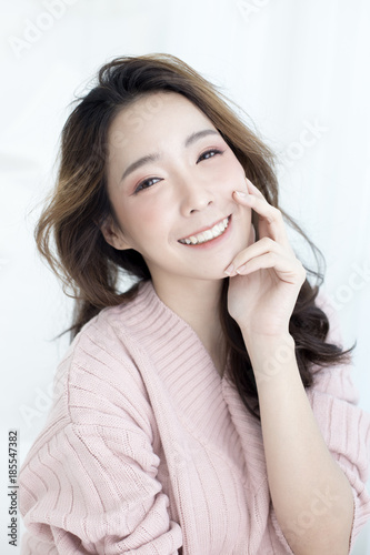 Attractive Asian Woman wake up on bed with happy emotion, People lifestyle concept.