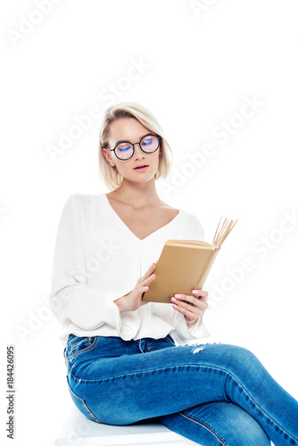 attractive blonde girl in glasses reading book, isolated on white