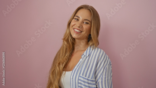 Attractive blonde woman smiling confidently over isolated pink background with her long hair cascading over her shoulders