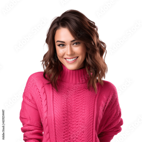 Attractive brunette woman wearing bright pink cozy knitted sweater. Isolated on transparent background
