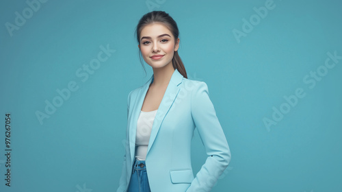 Attractive brunette woman with bob hair in luxury clothing stands against a solid blue background. Young pretty smiling girl manager Business fashion style concept