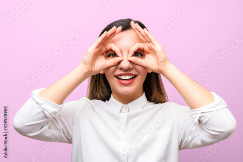 attractive businesswoman or student with red lips in white shirt smiling and making glasses from her fingers against purple background