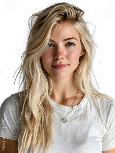 Attractive fair skinned woman with blonde hair gazes directly at camera with neutral expression on white background.