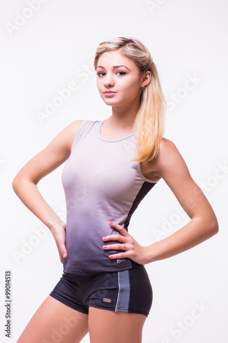 Attractive fit woman exercising in studio with copyspace. Image of healthy young female athlete doing fitness workout against grey background.