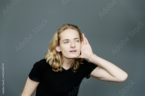Attractive guy with long blonde hair, substituting a hand to his ear, eavesdrops with an interested face on a gray background.