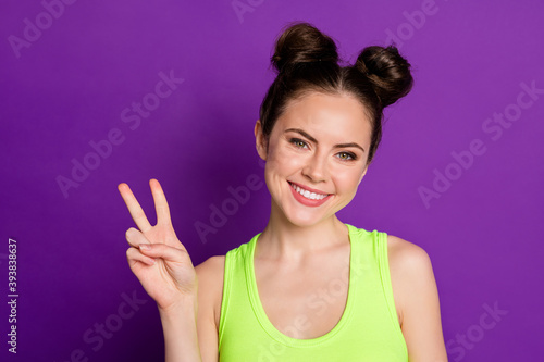 Attractive lady two funny buns showing v-sign symbol wear green singlet isolated violet color background