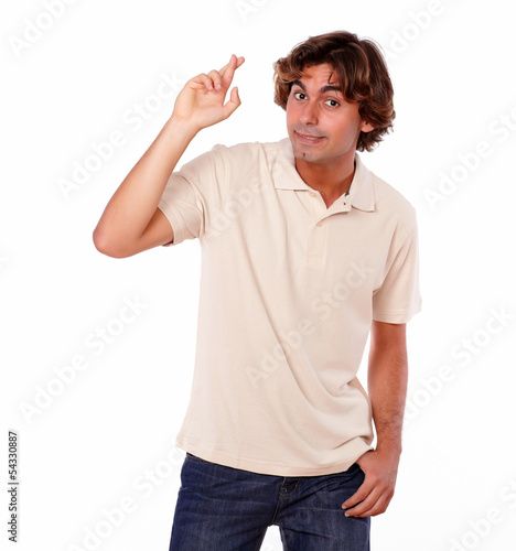 Attractive man crossing fingers while standing