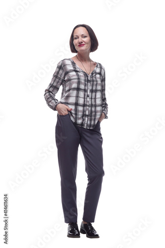 attractive mature woman in trousers and plaid shirt .