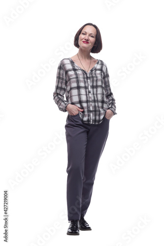 attractive mature woman in trousers and plaid shirt .
